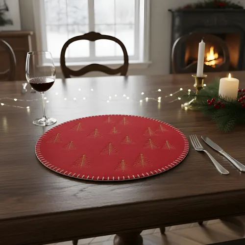Jogo americano redondo em feltro, com elegante estampa de árvores na cor dourada. Um item decorativo que une praticidade e charme, perfeito para compor a mesa posta natalina com brilho e sofisticação.