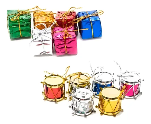 Kit pendente natalino composto por 12 peças sortidas em formato de mini tambores e presentes, cada um com aproximadamente 2,5cm. Produzidos em material leve e resistente, são ideais para decorar árvores de Natal, guirlandas, arranjos ou complementar enfeites temáticos, adicionando brilho e charme especial à sua decoração.
